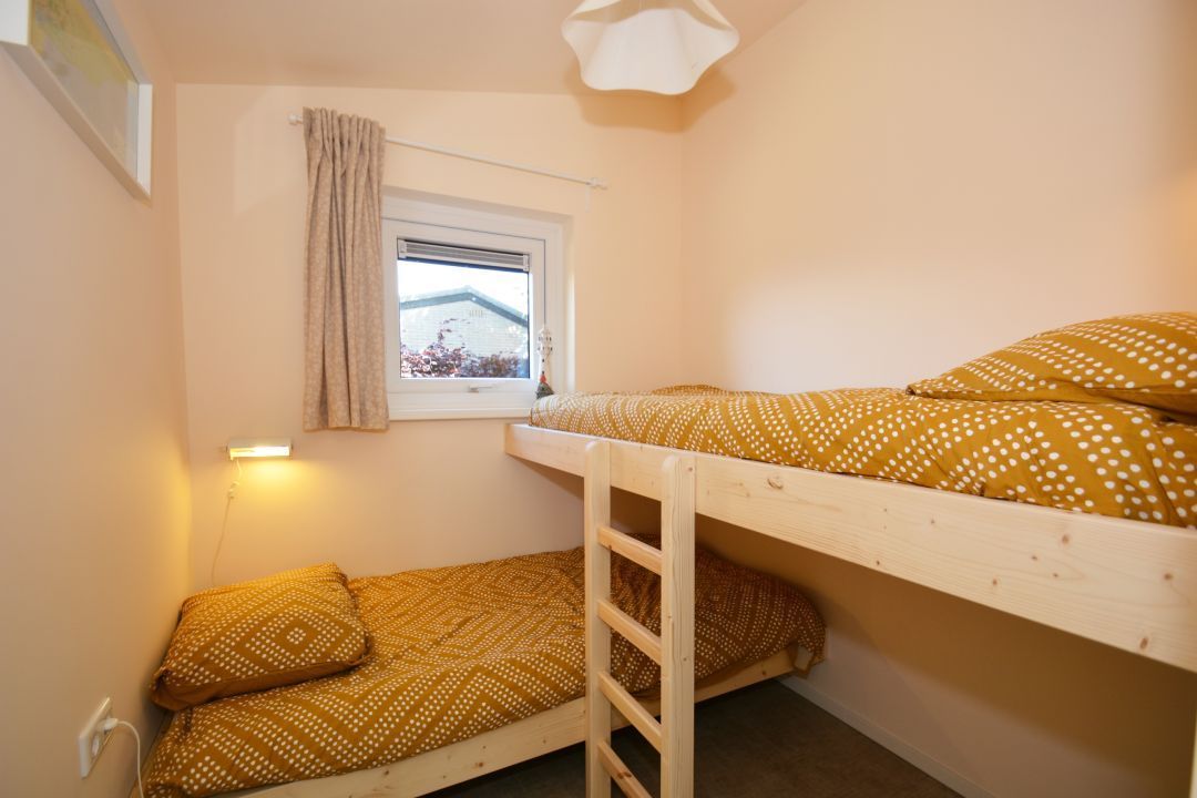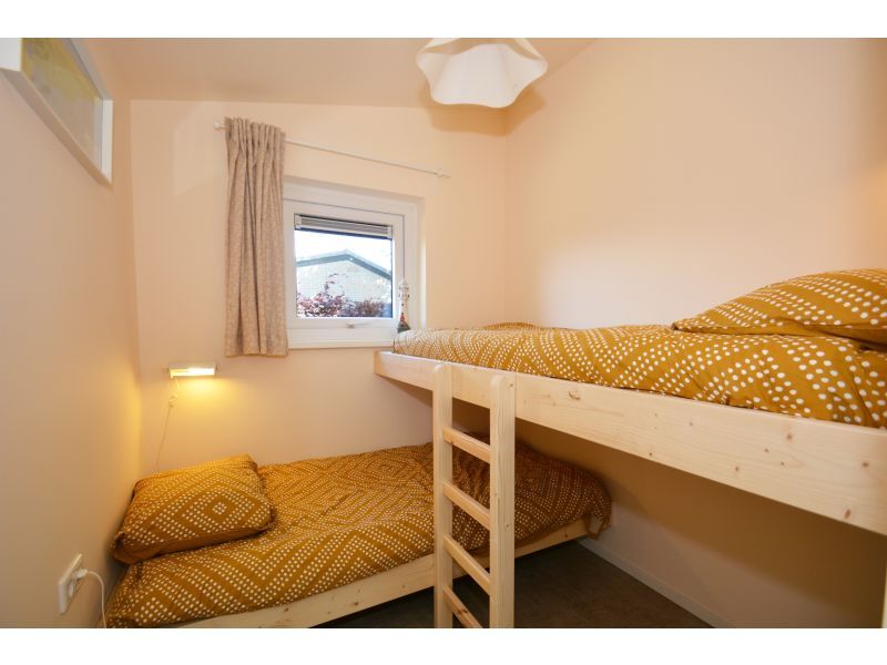 The bungalow has underfloor heating and insulated glass. In the shower room, in addition to underfloor heating, there is also a radiator. In the living room, there is ample closet space available for guests. There are also covers for organized storage.
