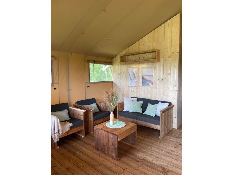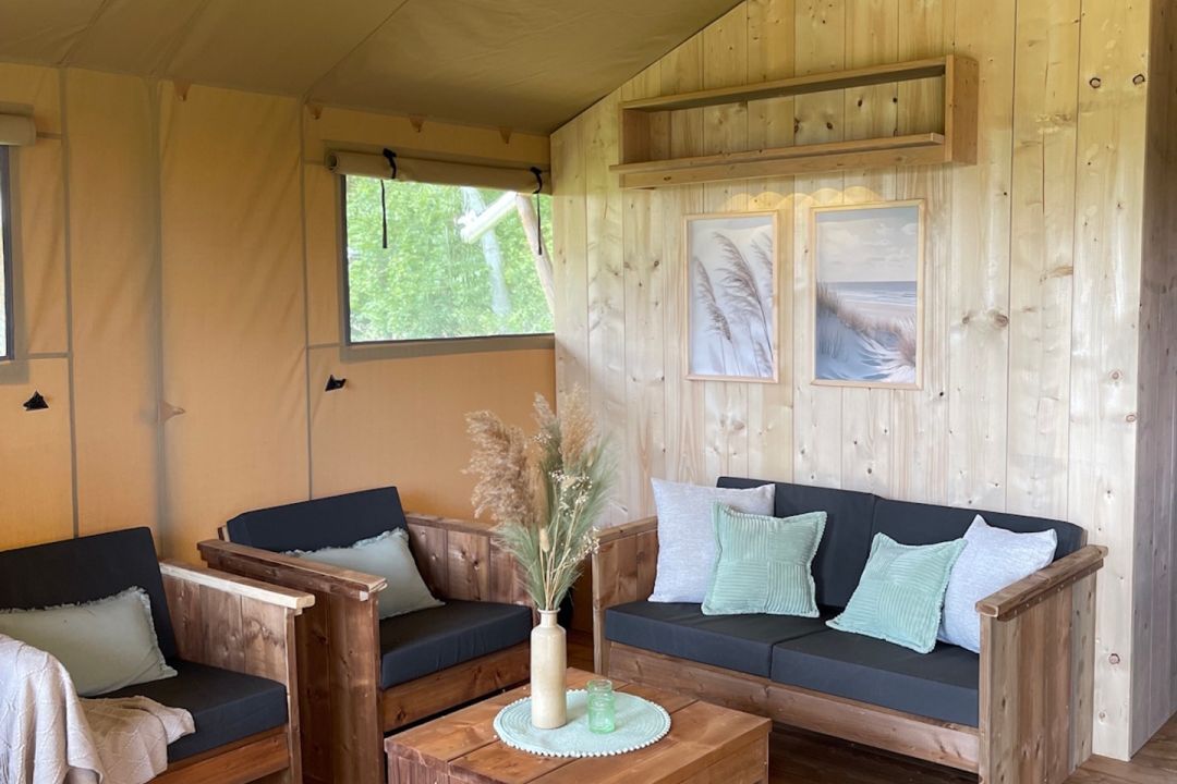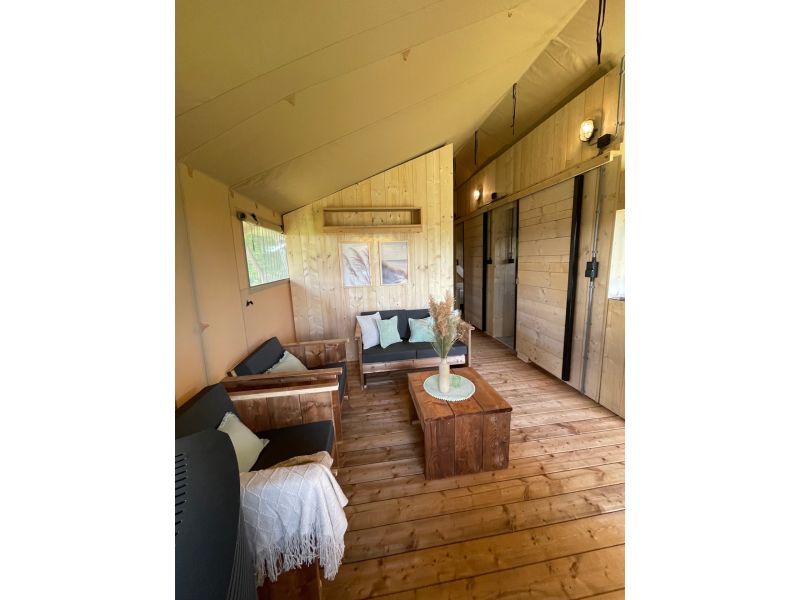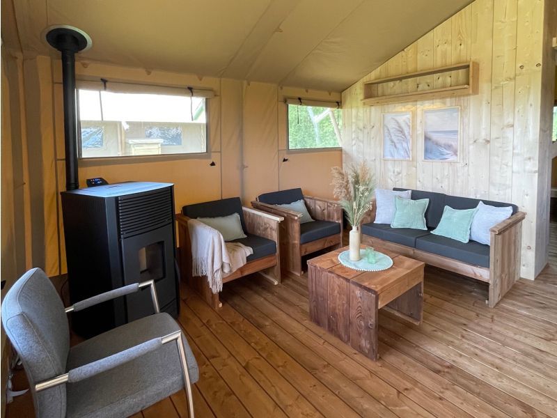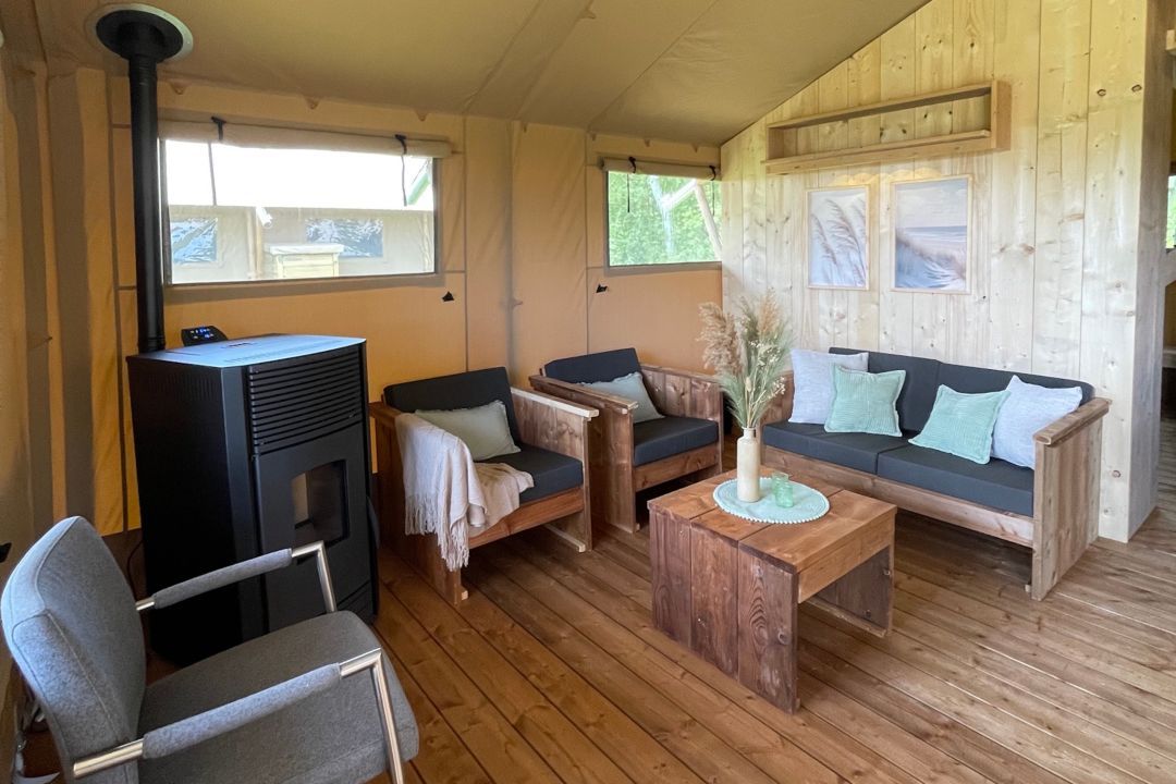 Enjoy the ultimate outdoor feeling in our comfortable safari tent, without sacrificing luxury! This atmospheric tent is spacious and equipped with a cozy pellet stove, so that you stay nice and warm even on cooler evenings.