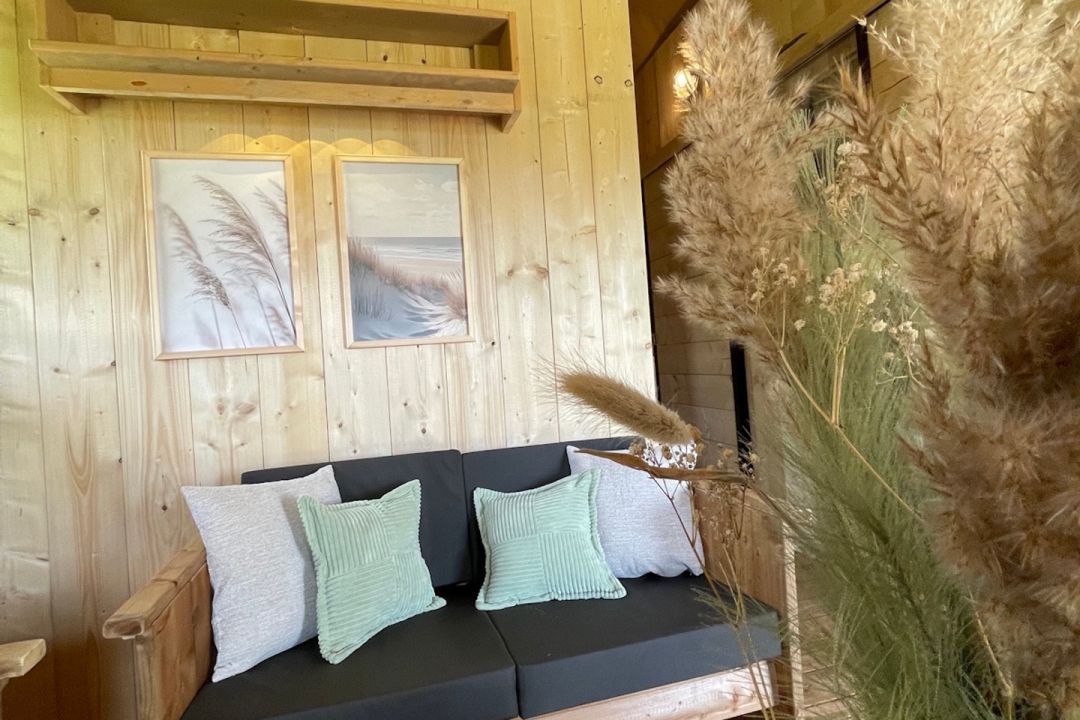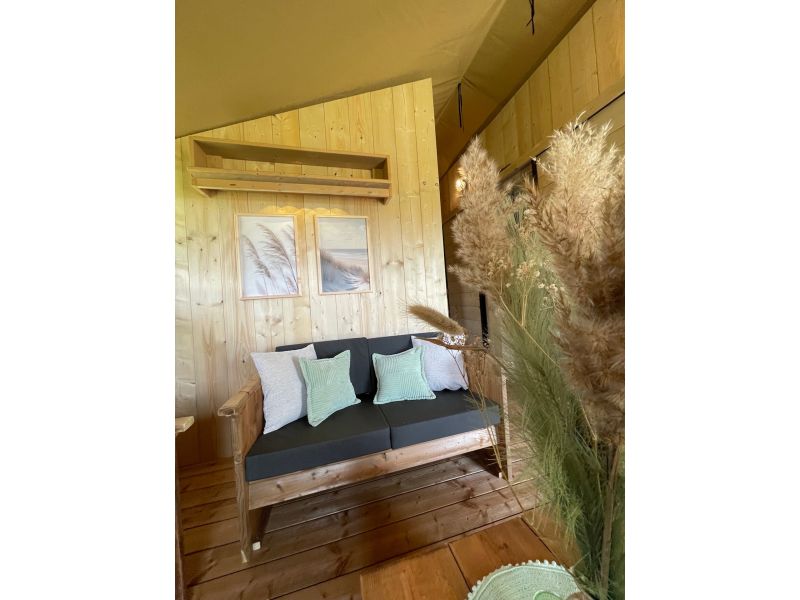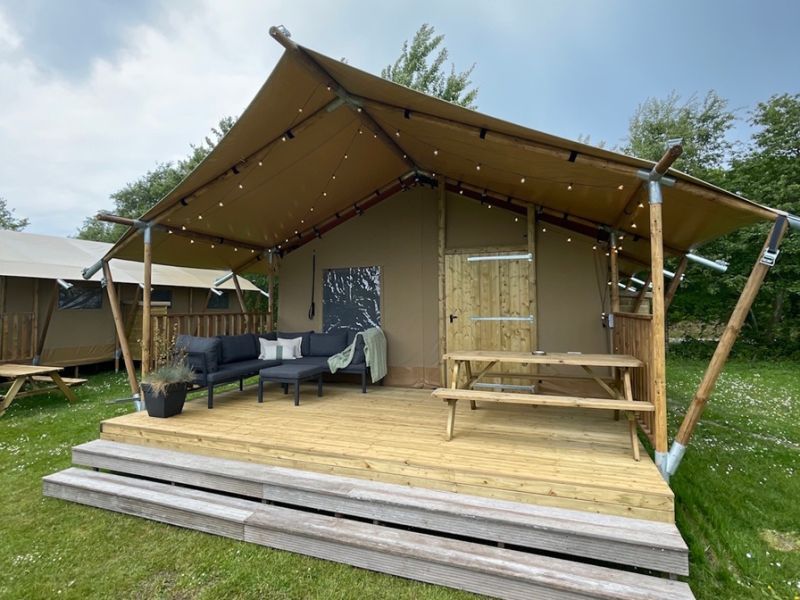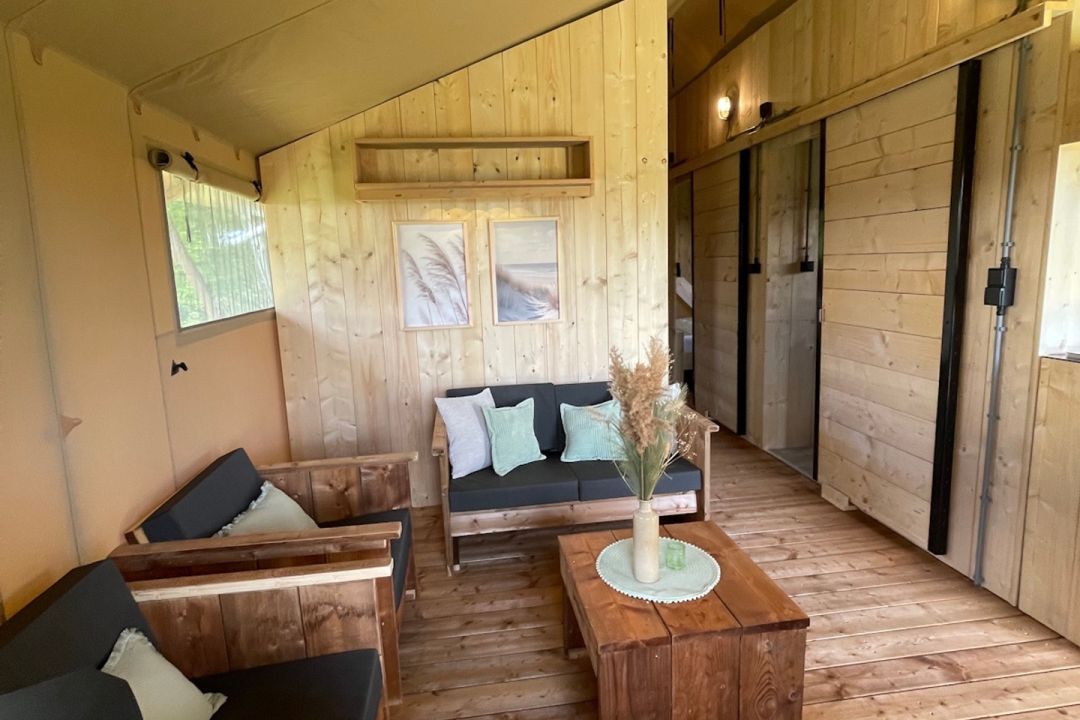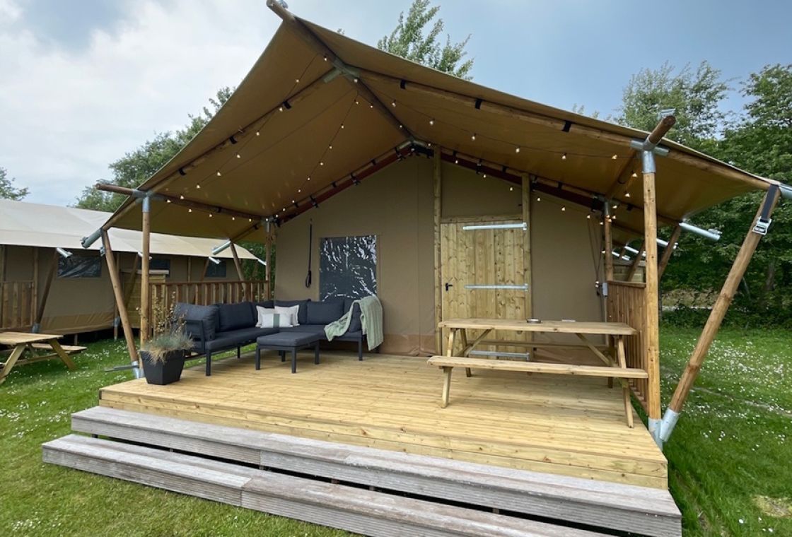 Enjoy the ultimate outdoor feeling in our comfortable safari tent, without sacrificing luxury! This atmospheric tent is spacious and equipped with a cozy pellet stove, so that you stay nice and warm even on cooler evenings.