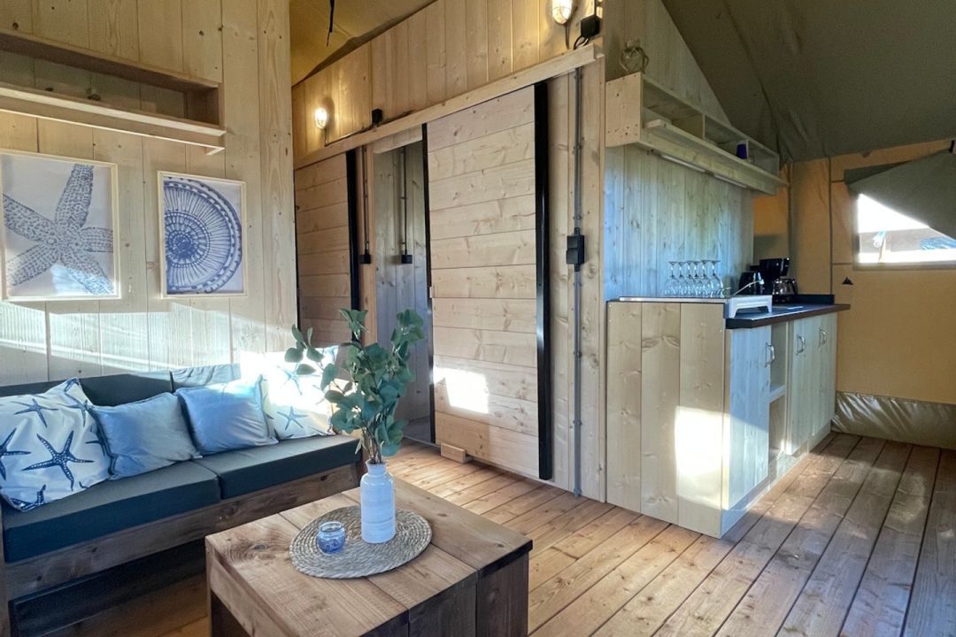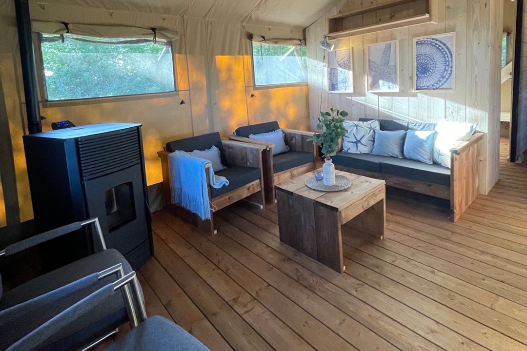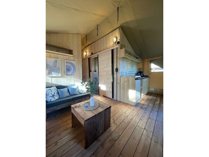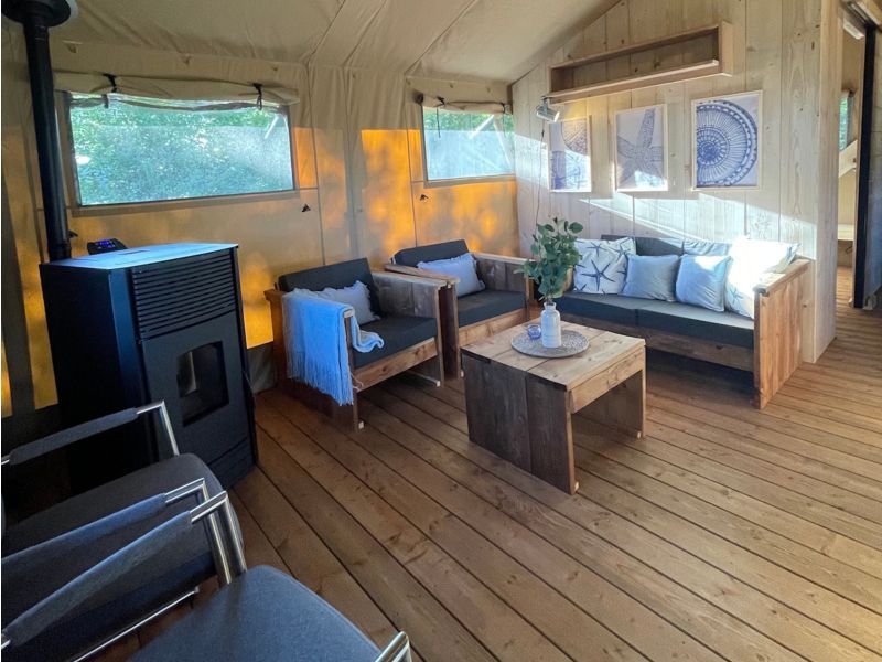 Experience the real outdoor life in our spacious and atmospheric safari tent, where comfort and nature come together perfectly. Thanks to the pellet stove, you can also sit comfortably on chilly evenings, while enjoying the cozy atmosphere.